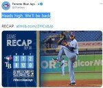 ‘에이스’ 류현진의 부진 속에 토론토 블루제이스의 가을야구도 일찌감치 막을 내렸다. 매 경기 인상적인 코멘트로 눈길을 끌었던 토론토 구단 SNS도 내년을 기약했다. 토론토는 1일(한국시간) 미국 플로리다주 세인트피터즈버그 트로피카나필드에서 열린 2020 메이저리그 아메리칸리그 와일드카드 시리즈(3전2선승제) 탬파베이 레이스와 2차전에서 2-8로 패했다. 앞서 1차전을 1-3으로 졌던 토론토는 2연패로 일찌감치 짐을 싸게 됐다. 반면 탬파베이는 2연승으로 디비전 시리즈에 진출했다. 선발투수 류현진이 1⅔이닝 8피안타(2피홈런) 1볼넷 3탈삼진 7실점(3자책)으로 난조를 보였고 타선 역시 7안타 2득점에 그쳤다. 올 시즌 32승28패 승률 0.533를 기록한 토론토는 아메리칸리그 와일드카드로 포스트시즌 티켓을 거머쥐었다. 2016년 이후 4년 만에 오른 포스트시즌 무대. 하지만 탬파베이를 상대로 전력 열세를 극복하지 못했다. 성과도 많았다. 에이스로 영입한 류현진이 정규시즌에서는 좋은 활약을 펼by