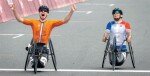 미치 팔리저(26·네덜란드·왼쪽)가 1일 일본 시즈오카현 오야마정에 있는 후지 인터내셔널 스피드웨이 일대에서 열린 2020 도쿄 패럴림픽 사이클 남자 도로 H5 경주에서 프랑스 대표 로이크 베르뇨(43)를 물리친 뒤 기뻐하고 있다. 두 선수는 이날 79.2km를 나란히 2시간24분30초에 달렸지만 팔리저의 앞바퀴 중심이 먼저 결승선을 통과하면서 팔리저가 금메달 주인공이 됐다.