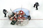 3일 미국 미네소타주 세인트폴에서 열린 북미아이스하키리그(NHL) 경기 3피리어드 때 캘거리 선수들(붉은색 등번호)이 골문 앞에 한데 몰려 미네소타의 공격을 온몸으로 막아내고 있다. 캘거리는 상대 슛 29개 중 28개를 막아내며 세이브율 97%를 기록한 골리 야코브 마르크스트룀의 신들린 선방으로 3-1 승리를 거뒀다.세인트폴=AP 뉴시스 by
